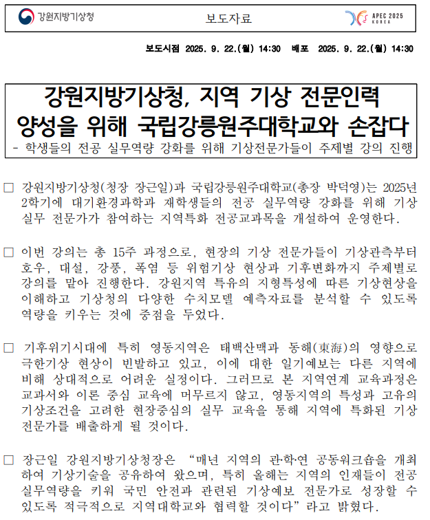 [글로컬사업] 강원지방기상청 기상 전문가 초청 지역특성화 전공교과목 운영
