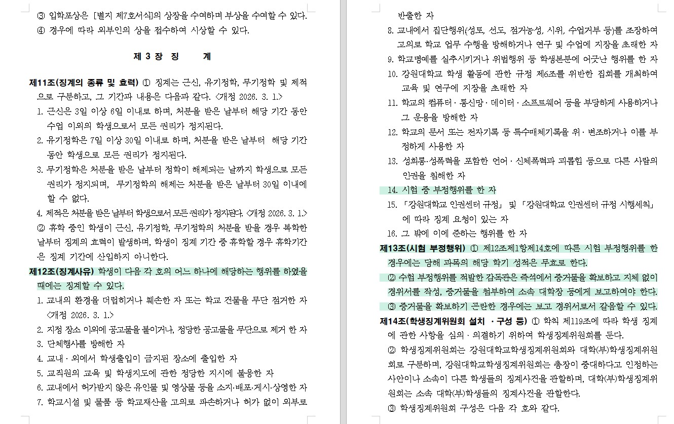 강원대학교로 통합됨에 따라, 시험 부정행위가 징계사유가 될 수 있음을 공지합니다